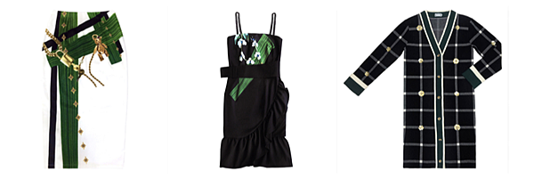 LABRIELLS《2018秋冬系列》由左至右:熊寶貝印花鉛筆裙,建議售價:390USD / 地下戀情印花連衣裙,建議售價:483USD / 釘珠黑綠針織長外套,建議售價:483USD。