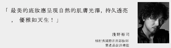 植村秀國際首席彩妝師淺野裕司( YUJI ASANO )表示:全新 #亮很久氣墊「天生光圈鑽石光氣墊粉餅」不僅實現每一個女人都 想要擁有的鮮奶油光澤底妝,更讓宛若天生的光澤底妝可以如影隨行:先以最保濕、最輕盈的360度妝前隔離打底神器「極保濕 輕感防護乳SPF50 PA+++」做好完美的妝前隔離打底,再搭配被媒體譽為本世紀最令人驚艷的刷具「#55零刷痕粉底刷」,一 刷 #亮很久粉底「天生光圈鑽石光粉底液」,就是精雕細琢的同時最無瑕,保濕透亮的鮮奶油光,針對重點部位輕拍 #亮很久氣 墊「天生光圈鑽石光氣墊粉餅」,實現高遮瑕、更具立體層次的完美底妝!