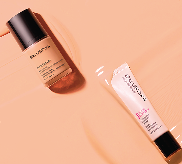 在完成妝前保養後,先使用被專業彩妝師們譽為最保濕、最 輕盈的360 度妝前隔離打底神器「極保濕輕感防護乳 SPF50 PA+++」,除了有最高規格的防曬防護外,牡丹、 水蓮以及玉米等天然植物萃取,能為肌膚注入超強保濕力, 加上植村秀獨家專利「超貼妝科技」和「零暗沉配方」,質 地不僅很輕盈、很服貼,保濕同時還能吸附油脂,全天候不 泛油光還能帶出後續粉底最真實的色彩!