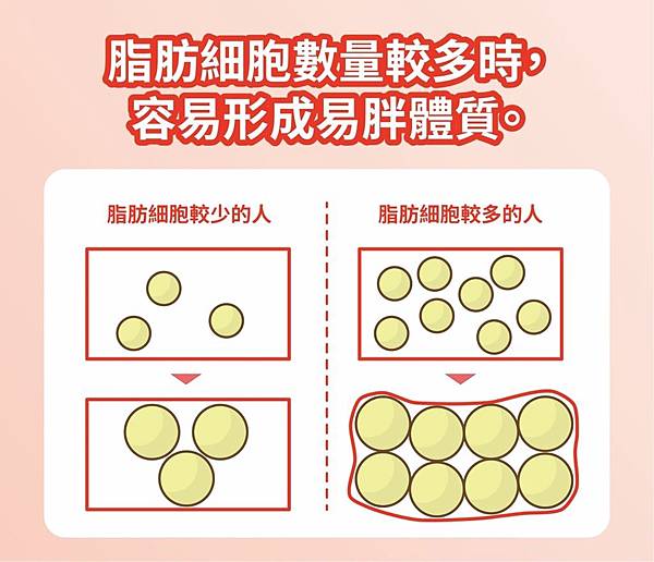為何有些人不易變胖?有些人努力減肥卻深陷復胖溜溜球效應之苦? 趙函穎營養師指出,人體內堆積的脂肪量由脂肪細胞數量與脂肪細胞體積共同決定。過去談減重時大家關注的是如何透過運動與飲食,降低脂肪細胞內的脂質存量、減少細胞體積,卻忽略的脂肪細胞數量對易(復)胖與否的影響性。
