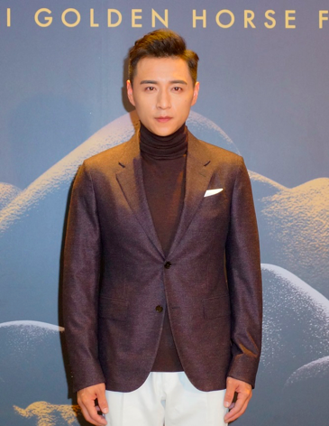 台灣演員鄭人碩身穿ErmenegildoZegna紫褐色羊毛西裝外套內搭深褐色高領毛衣,