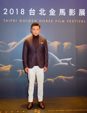 搭配白色休閒長褲、白色口袋巾與深褐色皮鞋出席金馬影展《人面魚紅衣小女孩外傳》首映會