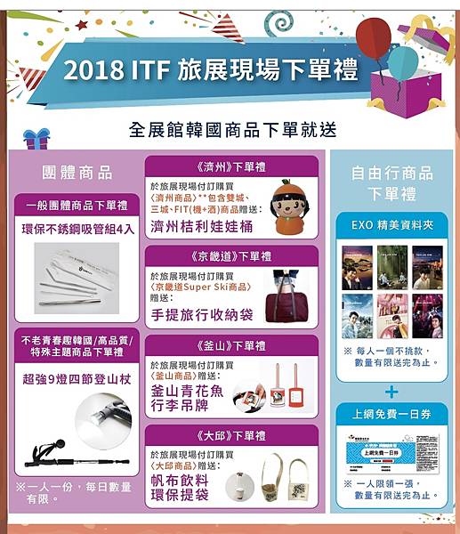 - 自由行商品下單禮《EXO精美資料夾》加《Wi-Go WIFI一日券》,每人限領一份,數量有限,
