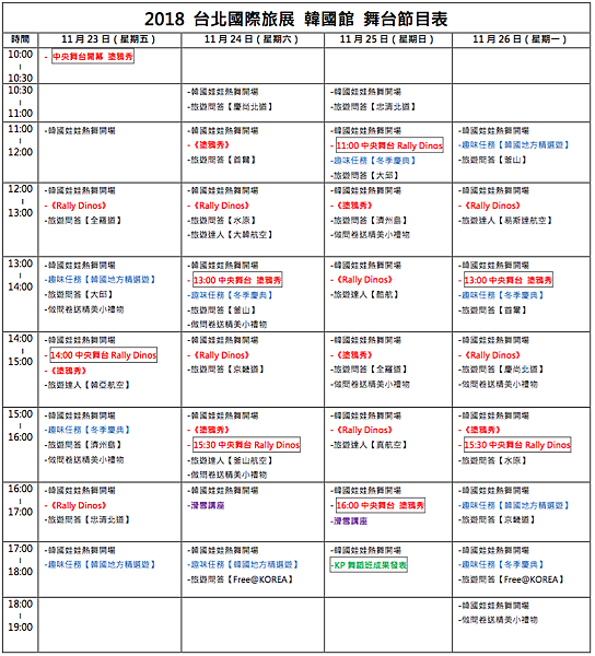 每個整點不但有可愛的韓國大頭娃娃表演K-POP舞蹈,也將有不同的旅遊主題介紹,例如首爾、京畿道、江原道、慶尚北道、大邱、釜山、全羅南北道和光州、忠清南北道、濟州等地方政府來台一起推廣,或是航空公司、旅行社達人分享等,希望能讓台灣民眾們更了解韓國的多樣化,欲知更詳細的節目安排,請參考韓國館舞台時間表(如附件一)。
