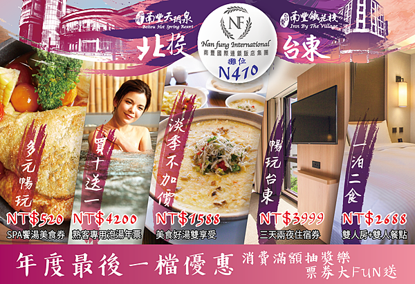 南豐國際連鎖飯店集團(N410) 11 ⽉月年終慶,11/23-11/26 ITF 台 北國際旅展超值優惠接⼒力開跑,北投南豐天玥泉會館推出「美⾷食泡湯 雙享券」、「⼤大眾裸湯年票組」、「泡湯美⾷食 SPA 暢玩券」等多種消 費選擇,原價$2,358 元的禪室湯屋、主廚雙⼈人餐之雙享組合,現只 要$1,588 元,下殺 64 折,⼤大眾裸湯年票組 10 張約 52 折,買 10 張 還加贈 1 張,年度最後⼀一檔旅展限定優惠,針對單⾝身族或年輕群族, 更推出 520 暢玩券,不管是要泡湯、雙⼈人下午茶亦或是經典全⾝身肌⾁肉 放鬆紓壓療程,⼀一券到底,滿⾜足消費者不同的樂享需求。