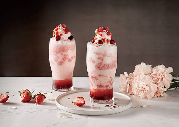 搭配「草莓奶油曲奇冰沙」是以牛奶、新鮮草莓、天然餅乾風味調製而成,杯身的草莓淋醬如雲彩一般夢幻,今年冬季讓人無法忘懷的滋味。
