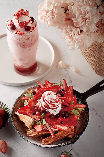 12月10日起至明年2月14日情人節,黑浮咖啡全門市供應草莓卡士達冰淇淋鬆餅、草莓奶油曲奇冰沙。