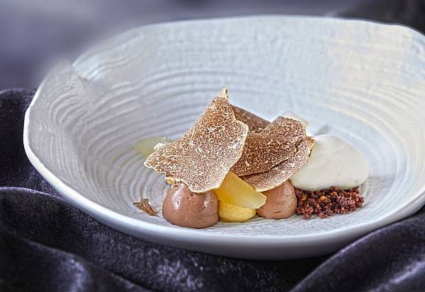 嚐來滋味苦甜的巧克力慕斯,搭配自製的酒釀冰淇淋,激盪出令人意想不到的美妙滋味。上桌時,片片白松露灑落在上就好似雪花紛飛的美景般,讓人賞心悅目又愛不釋口!