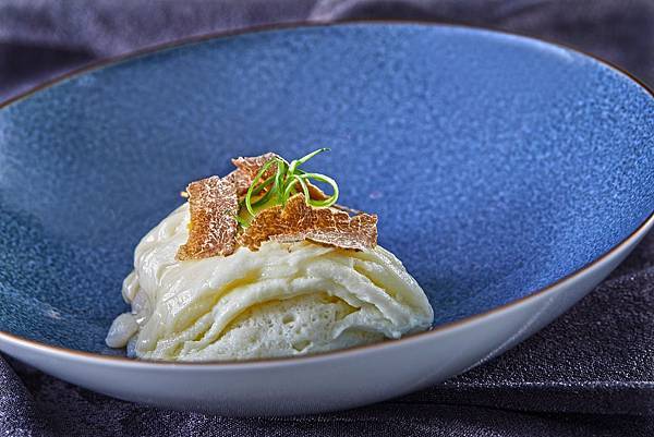 謝文主廚先將澎湖龍蝦去殼取肉,切好的龍蝦肉以高湯燙熟後置於盤中。接著將蛋清加入鮮奶混合均勻後,以小火慢慢堆炒,稍加鹽巴簡單調味,製成炒蛋白覆蓋於龍蝦球上。上桌時,再將白松露現刨入饌,入口品嘗,蛋白炒得滑嫩,龍蝦球的味道清淡不會影響白松露香氣,反而白松露更能帶起龍蝦肉的鮮甜,兩者雙得益彰、完美契合!