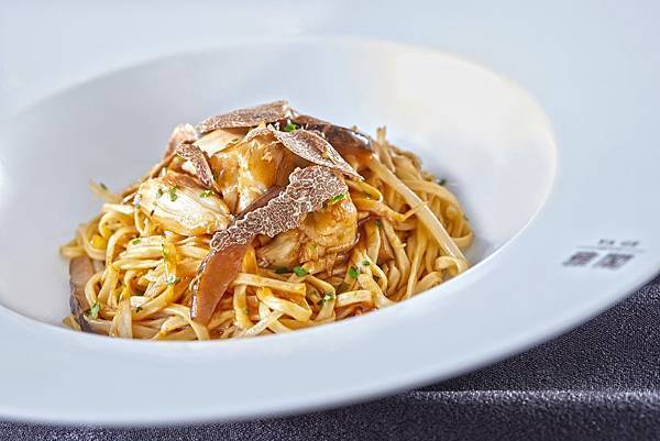 取肥美的台灣紅蟳拆肉,連同菇片燴炒港式伊麵,起鍋前再灑上銀芽略為拌炒即成。品嘗時,再刨入白松露,讓鑊氣十足的伊麵藉由奔騰的熱氣將白松露的珍香發揮至極致,令人無比沉醉。