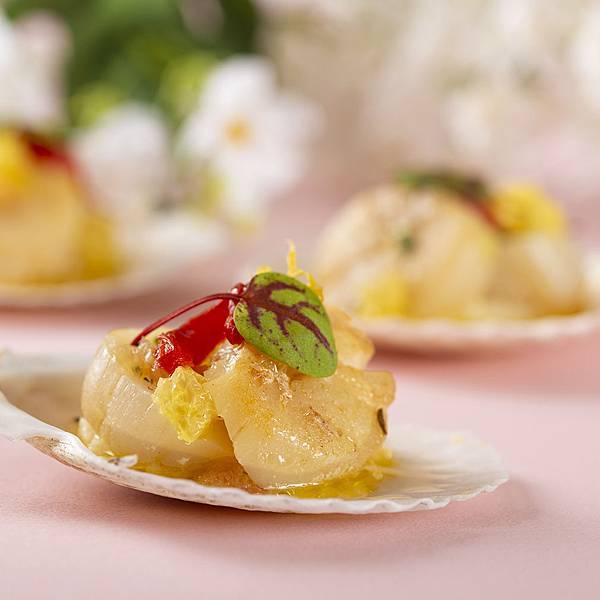 超級吸睛亮眼的干貝,來自日本北海道,搭配酸甜口感的風乾番茄與柳橙醬,整體設計清新自然,像走在浪花拍打的海岸自在舒心,嚐一口甜鹹交織帶著淡淡番茄的酸度,就像Melody和女兒約定的Date Night親密感。