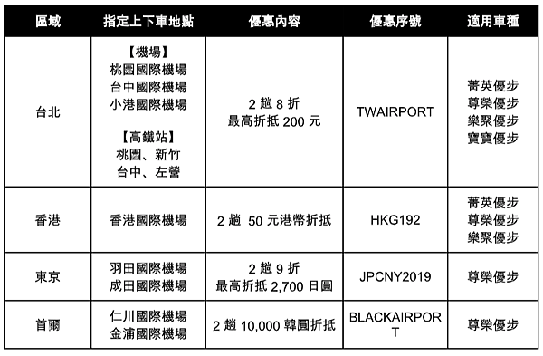 為使旅客春節旅遊期間玩得盡興又安心,Uber 推出專屬乘車優惠,讓台港日韓四地遊客在春節旅遊期間,擁有安全、可靠和優質的乘車選擇,讓年節旅遊更便利。自 2019 年 1 月 19 日起至 2 月 17 日止,在台灣的旅客只要輸入序號「TWAIRPORT」,並於指定機場或高鐵站搭乘 Uber,即可享有 2 趟 8 折的乘車優惠 (每趟次最高折抵 200 元,適用於菁英/尊榮/樂聚/寶寶優步);此外旅客抵達香港及日韓地區,輸入該區專屬優惠序號,同樣可享當地機場 (指定上下車地點) 乘車優惠。