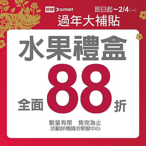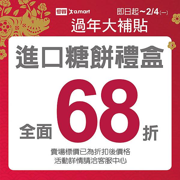 愛買即日起再加碼推出8大春節連假實用品類折扣,即日起~2/4體面送禮現省「進口糖果餅乾禮盒全面68折(賣場標價已為折扣後價格)」、「水果禮盒全面88折」,數量有限售完為止;即日起~2/12大掃除好幫手「清潔/掃除用品滿500元送50元」,團聚吃喝超低門檻優惠「包裝米/食用油滿299送30元」、「泡麵/麵條/冬粉滿388送40元」,穿新衣迎好運「男休閒褲/西裝褲/男女外套/防風背心單筆滿2000現折200元」、「男/女/童襪滿300元現折30元」。