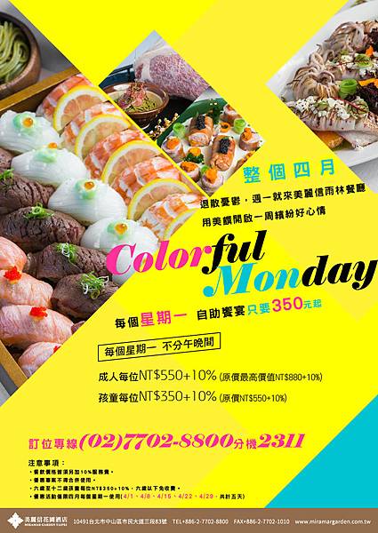 美麗信花園酒店一樓雨林餐廳於四月份的每個星期一,推出《Colorful Monday》限時回饋專案,每周一不分午晚間時段,每位成人只要NT$550+10%(平日午間原價780+10%、平日晚間原價NT$880+10%) ;六歲至十二歲孩童,每位NT$350+10%。難得推出的繽紛好康專案非吃不可,美味佳餚饗宴予饕客身心無比喜樂滿足,忘卻現實種種煩惱,只憶味蕾感動,敬邀嘉賓呼朋引伴洗去"Blue Monday”的標籤。