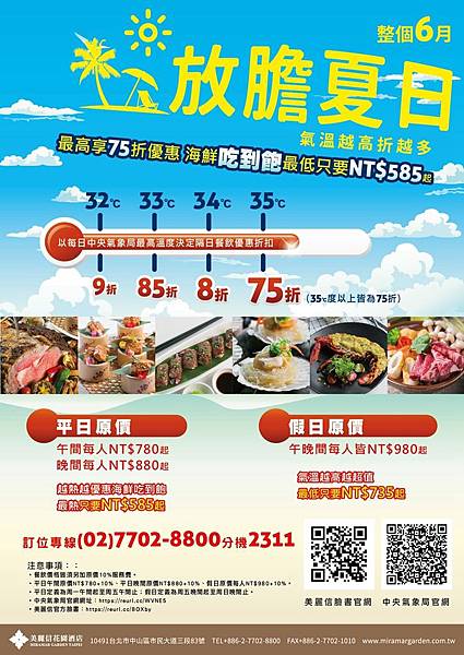 雨林餐廳6月1日起(六)至6月30日(日)止,針對炙熱夏天推出【放膽夏日˙氣溫越高折越多】高溫餐飲活動;每日將依照「中央氣象局」官網顯示的台北地區傍晚17:00點前最高氣溫,於美麗信官方臉書17:30公佈隔日雨林餐廳繽紛百匯自助餐折扣!雨林餐廳平日午間每人NT$780+10%、平日晚間每人NT$880+10%;假日午晚間每人皆NT$980+10%,現正推出的蠔鮮蠔蚌海味季餐飲活動,平日午間高溫折扣最低竟然只要NT$585;晚間只要NT$660;假日海味大餐每人最低也只要NT$735(以上價格皆需另加原價10%服務費)。
