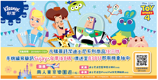 歡慶『玩具總動員4 X舒潔獨家聯名限量款系列』上市,即日起至7月底止舒潔品牌加碼推出迪士尼聯名系列消費簡訊抽獎活動,活動期間內凡消費者購買舒潔迪士尼商品任三件,依指示完成簡訊登錄即可參加抽獎,獎項內容包括頭獎兩人同遊東京迪士尼等,活動詳情可洽活動網頁: https://sujay201906.83811.tw。