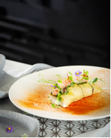 可曾想過千層麵變形成卷狀的嗎?主廚將傳統的千層麵變化成一道屬於自己的創意料理!將茄子加入麵衣炸過之後,再捲入絲翠奇亞乳酪佐上一層青醬和日本甜蝦,最後撒上自製的番茄粉!繁複的工序造就了全新的義式千層麵!柔軟醇香的乳酪是義大利麵的好朋友,青醬和番茄成功扮演了平衡這道佳餚的配角。是馬可波羅餐廳不可錯過的特色單點!