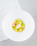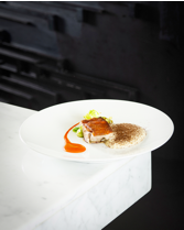 這是一道主廚的全新創意料理!這道菜的靈感來自於他在台灣的這幾個月,深知台灣人對豬肉的喜愛因此選用台灣在地豬五花肉做研發。首先,乳豬燉煮後將其表面煎至焦黃,使其口感外酥內嫩。再搭配孢子甘藍和以黃芥末、蛋白和美乃滋製成的芥末泡泡平衡其中的油膩感,最後撒上獨特的配角—咖啡粉。是一道風味迷人的佳餚!