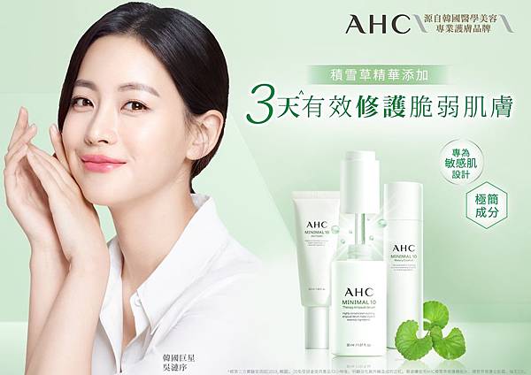 • 「AHC 積雪草修護安瓶精華」:僅添加 9種極簡安心成分,除用簡單、純淨、有效的高濃度積雪草精華,全面修護肌膚,同時富含印度苦楝樹與抗氧化成分紅花籽精華油,針對局部明顯泛紅肌膚、乾癢部位,可以增加用量加強修復。