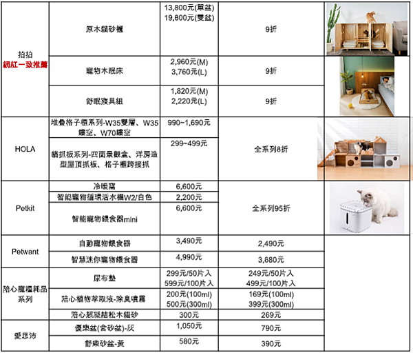 據農委會統計,2017年全台犬貓飼養數超過250萬隻;《哈寵誌》市調分析,每月花費1,000~2,000元的飼主佔4成;超過2,000元的飼主比例更從1成多成長至24%,顯示飼主投注在毛小孩上的花費日漸增加。HOLA多年來為寵物友善商場,走在賣場裡,時常可見主人和毛小孩一同逛HOLA的溫馨畫面,此服務緣自「顧客想和小孩一同逛街的心情」。HOLA進一步將服務面向拓展至商品,除了HOLA自行設計開發毛小孩格子櫃與貓抓板,更引進11家在寵物界享譽已久的寵物糧食與用品品牌,如「陪心寵糧」、「自然食」,訴求天然、營養、保健配方;洗沐品牌「毛起來」、「Pawpaw」,訴求不傷毛小孩肌膚、預防疾病;外出用品則引進從製作嬰兒推車轉戰寵物推車市場的「沛德奧推車」,以及寵物行為訓練師熊爸指定使用的「Ppark配件」,其餘還有「拍拍」、「IRIS」、「愛思沛」、「陪心寵糧耗品系列」、「Petwant」、「Petkit」等,從生活細節與顧客一同守護家中的毛小孩。