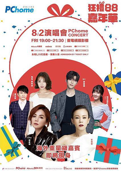 「狂禮88嘉年華」精彩不停歇,首日8/2(五)演唱會,由Bii畢書盡、S.H.E成員Ella陳嘉樺、 「鬼鬼」吳映潔、彭佳慧,以及一組海外重量級的表演團體領銜演出。年度代言人張鈞甯也將以特別嘉賓的身分首次現身PChome活動。即日起至7/9全站消費不限額登記再抽限量50組「狂禮88嘉年華8/2演唱會門票」。第二天在8/3(六)於華山文創園區舉辦同樂會,規劃各區包括:「狂聽音樂」、「狂扭愛心」、「網美狂拍裝置藝術」、「狂禮體驗品牌攤位」、「狂找鬍子大叔插畫家跨界合作」等精彩活動,全面升級視覺感官體驗。從白天到黑夜,音樂舞台邀請金曲獎最佳新人ØZI 、DJ RayRay、高爾宣、魏如萱、光良等12組知名藝人輪番演出。此外將邀請超吸睛IP好友們和BOXMAN鬥陣玩,一起感受最狂放的夏日嘉年華氛圍!
