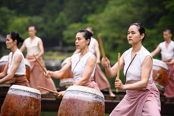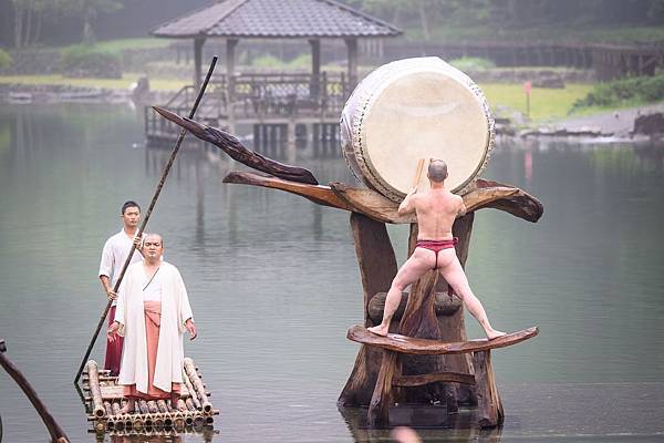 優人神鼓名列台灣前五大表演藝術深耕31年,此次演出以「水」為主軸貫穿整體創作,運用大神鼓、大銅鑼、大抄鑼架於湖水之上,鼓者以互動的方式融入明池之水,演出「崩」展現大水初來時的洶湧澎湃、「流水」表現緩慢又密集的細小水流、「聽海之心」代表大海深處的寧靜、「沖岩」以彈跳動作象徵海浪撞擊岩石也寓意人生面臨挑戰但確不斷地超越、「海潮音」以寬廣渾厚力量展現清明而深入人心之音,進而升起寧靜的感受。這五個段落在各種節奏與力道變換的鼓聲鑼音下,擬現水不同的狀態,比喻生命中所經歷各種樣貌。