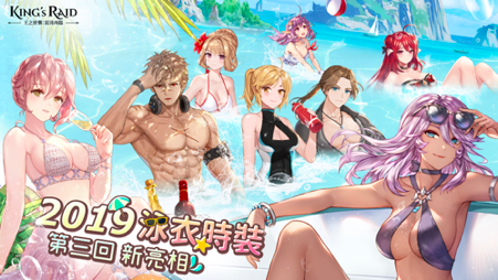 近百位的英雄角色,廣受玩家喜愛與熱烈討論,是《King’s Raid-王之逆襲》中一大特色!延續上兩回合的盛夏泳衣時裝,本次推出2019泳衣時裝第三回,共計八位英雄,將與所有玩家一起消暑一夏:信賴的金庫守護者-洛曼、女盾鉤子-黛彌兒、精靈盾-朵莎爾妲、血刺吸血鬼-愛兒琪、沈默的破壞之劍-伯倫海姆、監獄長-妮琪、浪跡大陸的女裁縫師-尤利婭、鋼之女侍-普莉西拉; 持用泳衣時裝時, 金幣獲取量將提升3%, 快來好好打扮自己最愛的英雄吧!