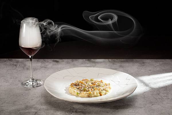 而負責設計此次調酒的稻葉智章(Tomoaki Inaba),來自日本東京,十八歲入行,迄今已有二十多年經驗。偶然的機會讓他愛上台北這座不夜城,他把在東京、倫敦與蘇格蘭等地的酒吧、餐廳、釀造所、蒸餾所之工作經驗糅合,在列強環伺的台北東區開設日式酒吧「WA-SHU和酒」,希望藉由「WA-SHU和酒」來推廣面貌多樣的日本酒類。日本職人的精神在他的身上亦展露無疑,他以日本壽司極簡的純粹為精神,讓每一款風味酒流露最單純的原味。例如為這次饗宴設計的Cacao Red Wine,即是以可可豆浸漬於日本紅酒中製成風味酒,混和杏仁糖漿和蘇打水,上桌前再灌入帶有木質香氣的煙霧,這款極有個性的調酒讓人一入口便清楚嘗到醇厚的紅酒交雜著可可清香微苦的氣息,巧妙呼應搭配味道偏重的「燉飯、古岡佐拉乳酪、杏桃、咖啡粉」,口中縈繞的盡是苦韻圓融濃郁的口感。又例如Dill Yogurt,是利用讓酒體結塊進行澄清過程以取得清澈酒液的優格浸泡法(Yogurt Washing),讓優格及茴香的特殊香氣徹底融入日本白酒中,啜飲時,所有的細節濃縮入口,正是一酒入魂最貼切的寫照,搭配以「酸」為靈感所設計的主菜「烤鵪鶉、菠菜與白腰豆泥、慢燉菊苣、陳年雪莉醋汁」,恰到好處的酸與鵪鶉肉汁的香甜令人稱絕!