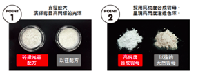 創新「碎鑽光芒配方」利用直徑較大的碎鑽片,演繹高閃耀光澤,搭配高純度合成雲母提升了眼影的閃耀度及透明度,創造出前所未有,兼具閃耀美感與高透明度的眼粧。