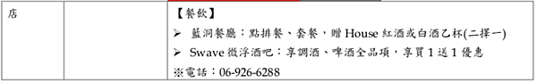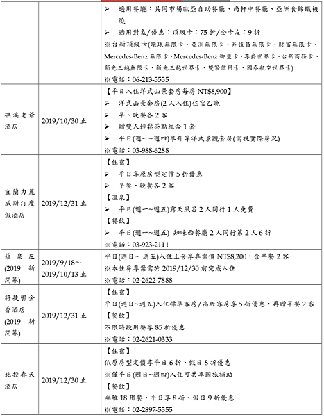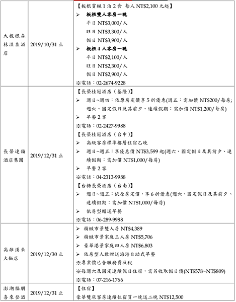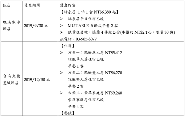 為滿足愛好自由行民眾的需求,台新銀行特別依據國人最愛的旅遊行程與多家知名飯店共同推出住宿刷卡付費優惠專案,本( 9)月30日前,礁溪寒沐酒店詠泉居平日一泊一食專案價NT$6,380元起;對於國人最愛的臺南訪古美食之旅,今(2019)年12月30日前,台南大億麗緻酒店一泊一食NT$5,412元起,讓民眾樂遊古都暢享在地美食;此外,尚有宜蘭力麗威斯汀度假酒店、長榮桂冠酒店等星級飯店平日定價5折起優惠;對於離島澎湖的福朋喜來登飯店,也推出豪華雙床客房連續住宿買一晚送二晚優惠價NT$12,500元;這些優惠專案均可同享政府每房折1,000元秋冬國旅補助。黃天麟籲請民眾呼朋引伴善用台新銀行的優惠享受臺灣之美。