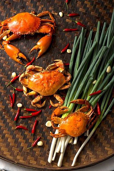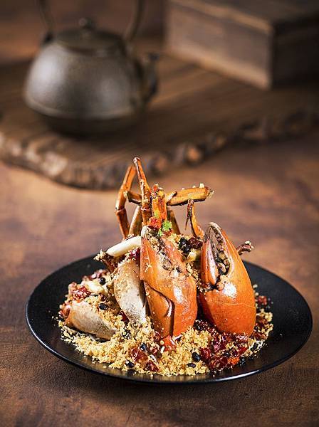 以四川特色風味為主調的一道香辣美餚,賴主廚選用盛產的三點蟹,以蔥、薑、紅露酒等辛香料醃製入味後,裹以麵粉下鍋油炸以充分鎖住肉汁,再與辣油、乾辣椒、花椒粒、八角、桂皮、小茴等十餘種辛香料及上湯提煉而得的主廚特製四川醬汁拌炒,鮮豔的色彩與醇厚的微辣滋味,絕屬蟹饕必嚐!