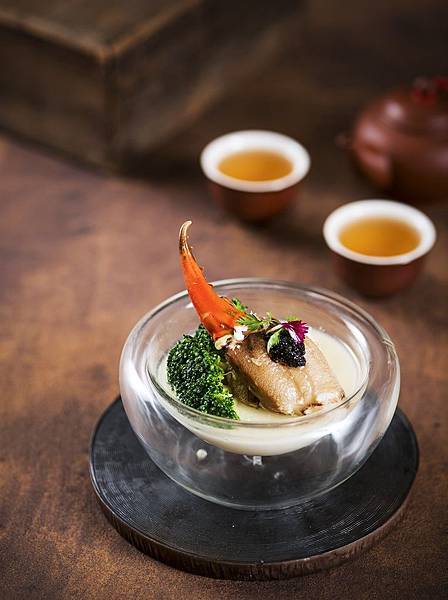 該道料理以優雅的西式盛盤、單純的料理方式,展現中式的極致美味。特選大沙公肥美多汁的蟹鉗部位,以清蒸方式保留其鮮鹹滋味;並將拌入清甜高湯製成的蛋白蒸作為基底,淋上些許高湯芡相輔相成;最後以法國進口黑松露醬細膩點綴上頭,絕美提升味蕾鮮香感受。
