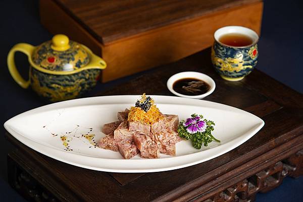 不愛剝殼的饕客們有福了!賴主廚以最擅長的冷盤料理,設計了這款不同於印象中大閘蟹吃法的料理。主廚細膩地將大閘蟹中的蟹肉挑出來,以洋蔥、薑一起入鍋炒過去其腥味。以經典的鎮江水晶肉的做法將後豬腿肉作底,鋪上滿滿的大閘蟹,最後以魚子和金箔點綴。主廚建議享用這道料理時可搭配上海經典鎮江醋,更可將蟹肉的鮮甜帶出。美味創意一口咬下豬肉與蟹肉相輔相成,讓人不禁想一嚐再嚐,停不下口!