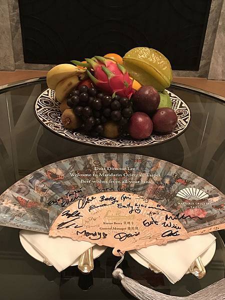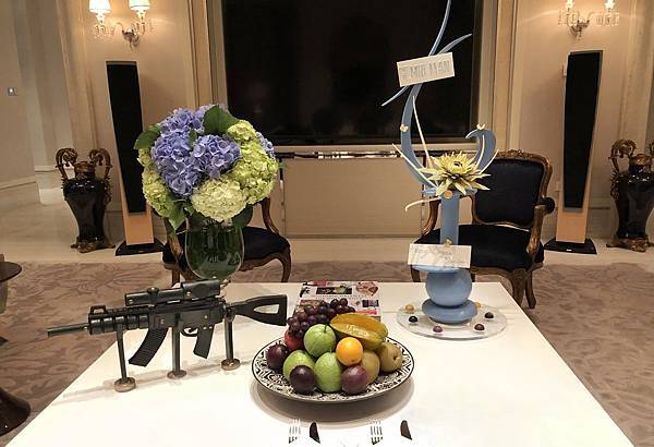 除上述奢華的套房設施,酒店更在套房內準備多項貼心的安排,包括酒店行政西點主廚Hin (任樂軒)發揮創意,以「雙子殺手」電影中威爾‧史密斯所飾演的頂尖殺手為靈感,巧手打造一把帥氣的「機關槍」巧克力以及巧克力雕花雕塑做為迎賓禮,另外,酒店還別出心裁地製作了代表文華東方酒店的巨型摺扇卡片,並準備豐富的當季寶島水果總匯迎賓,讓威爾‧史密斯深深感受到台灣滿滿的熱情及台北文華東方酒店貼心細膩的待客之道!。