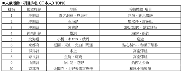 另外,在訪日旅客限定排名中,除了活用當地「地域性」的體驗外,還有各地名勝景點周邊的戶外活動。