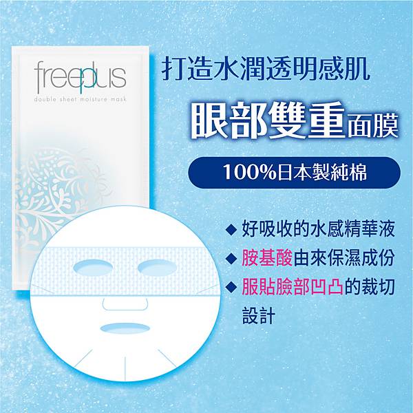 敏弱肌相較一般健康肌膚而言,較容易感到乾燥缺水。特別眼睛周圍為肌膚較薄,油脂分泌量也較少之處,能否給予足夠滋潤成為保養的首要課題。根據Kanebo化粧品調查,敏弱肌女性中有許多人利用片狀面膜幫助眼周保濕,除此之外,片狀面膜也在亞洲女性保養程序中不可或缺的一品,有鑑於此,freeplus全新推出秋冬新品-潤透純棉面膜(眼周加強型)。