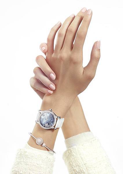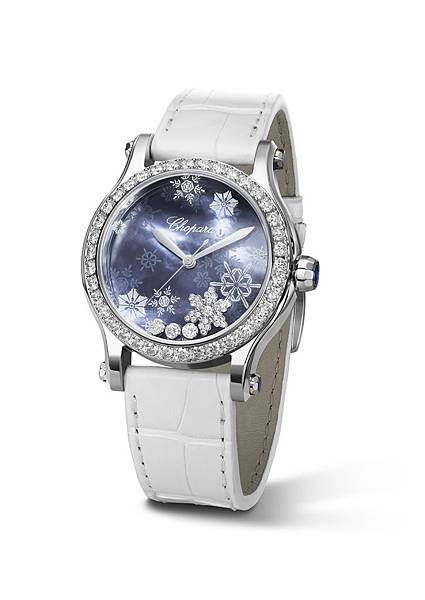 蕭邦從貝殼中悉心甄選的珍珠母貝材質,以製作錶盤Happy Snowflakes腕錶彰顯冬日的魔幻魅力,將轉眼即逝的晶瑩雪花恆久定格。品牌工匠在柔和細膩的藍色珍珠母貝錶盤,在精緻的錶面繪製細膩入微的雪花,手工雕刻,栩栩如生,彷若真實的雪花冰晶飄落於腕錶之上,稍縱即逝。精鋼錶殼搭配鑲鑽錶圈,彷彿白雪在陽光下熠熠發光。錶盤綴以3顆滑動鑽石與1顆滑動雪花鑽石歡快起舞,綻放獨特光芒。蕭邦還為這款詩意盎然的腕錶,特別搭配一款18K白金手鐲,其兩端分別點綴蕭邦標誌性心形圖案和環圈,兩兩相對。心形圖案內綴有一顆滑動鑽石,環圈內則綴有同樣輕快起舞的精緻雪花裝飾。
