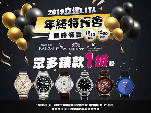 期盼已久的東方錶2019年終特賣會不同以往,今年首度南下台中,將於台北和台中各舉辦1場特賣活動,12/13在台北,12/20在台中。