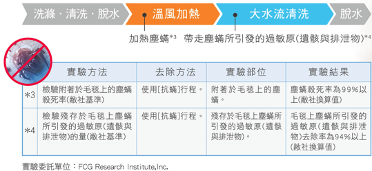 藉由溫風加熱潛藏於纖維中的塵蟎,再透過大水流清洗帶走塵蟎所引發的過敏原(遺骸與排泄物),潔淨防敏,穿衣加倍安心。
