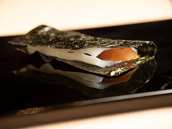 意想不到的美味還有「海苔烏魚子年糕」,主廚的作法是將新鮮日本烏魚子以鹽醃漬一天,接著以高度數的米酒頭浸漬一天,最後再花7到8天時間熟成,切塊後的烏魚子依序用年糕和海苔包覆,是一道在台北坊間難尋,只能在「鮨ます田」品嚐得到的獨門特色料理。而饗宴的最後由絕對不容錯過的「玉子燒」完美作收,增田承襲壽司之神小野二郎的作法,以蛋液混合山藥泥、蝦漿和糖製成,口感有如蛋糕般濕潤綿密,而「鮨ます田 台北」將延續東京「鮨ます田」令人驚豔的經典複刻美味。