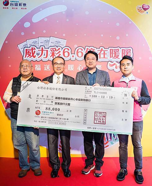 今(108)年10月21日於基隆市暖暖區「好運來彩券行」開出威力彩頭獎新臺幣6.6億元、1注獨得,是今年基隆市最高的單注頭獎。這位幸運中獎人特地準備88,000元的紅包回饋帶來好運的頭獎商店,「好運來彩券行」要把這份好運和愛心分享給更多人,將紅包全數捐贈「基隆市暖暖最用心幸福食物銀行」,並加碼捐贈一組安全造型防撞保護墊給「基隆祖孫館」。基隆市長林右昌今(19)日專程至「好運來彩券行」挺公益,呼籲全民持續支持公益彩券,台灣彩券公司總經理蔡國基也親赴現場道賀,經銷商於活動現場準備了「暖暖福袋」(米粉、衛生紙)分享給鄰里,盼透過活動將暖心公益理念傳遞給更多人,活動現場熱鬧、溫馨。