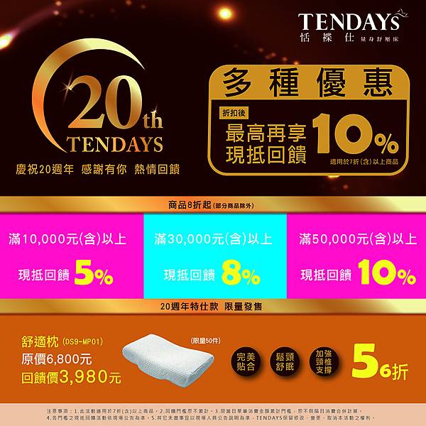 恬褋仕將延續20年來的一向堅持,如同TENDAYS寓意為「十天改善一生睡眠品質 」, 誓言為幫助更多的人們在短期間內,精準地找到適合個人的床墊、枕頭,讓人們睡得更健康。為歡慶TENDAYS 20周年的到來,自12月26日至3月1日,指定商品最低8折起,再加碼回饋抵扣如下: