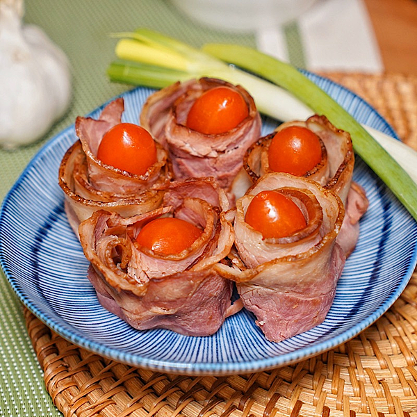 如果想讓冷盤料理更吸睛,可以再多花一點小心思準備。備妥蘆筍、番茄等生鮮蔬果和切片起司,用小火微煎的培根包捲起來,打造一口吃進嘴裡的美味,更不會讓賓客的雙手變得油膩,打破夜晚聚會的興致。