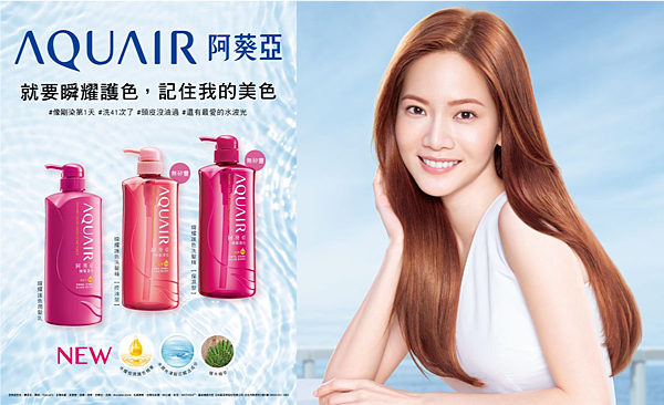 由台灣及日本資生堂研究所共同研發的AQUAIR阿葵亞,針對台灣的氣候與溫度調整的無矽靈配方,更符合台灣消費者需求,即使在台灣高溫潮濕的環境下,頭髮依然不易扁塌毛躁!想擁有與阿葵亞代言人曾之喬一樣綻放美色與極致水波光的秀髮,一定要試試全新AQUAIR阿葵亞「瞬耀護色系列」!