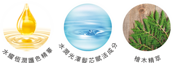 ●髮色恆采潤澤「水耀恆潤護色精華」,補充染後乾燥受損髮所需修護因子及水分,減緩髮色脫落流失,還原髮絲潤澤光采。