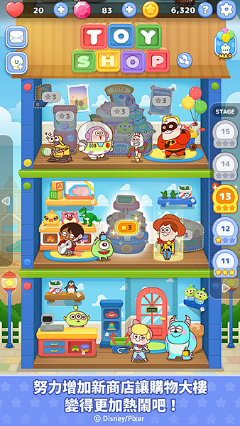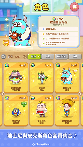迪士尼與皮克斯的電影角色們,化身為超可愛的店員,可以用金幣或是紅寶石從扭蛋中獲得。每間商店的建立,都可以聘請一名店員幫忙,店員之間也有不同的能力來幫助購物大樓的成長喔!