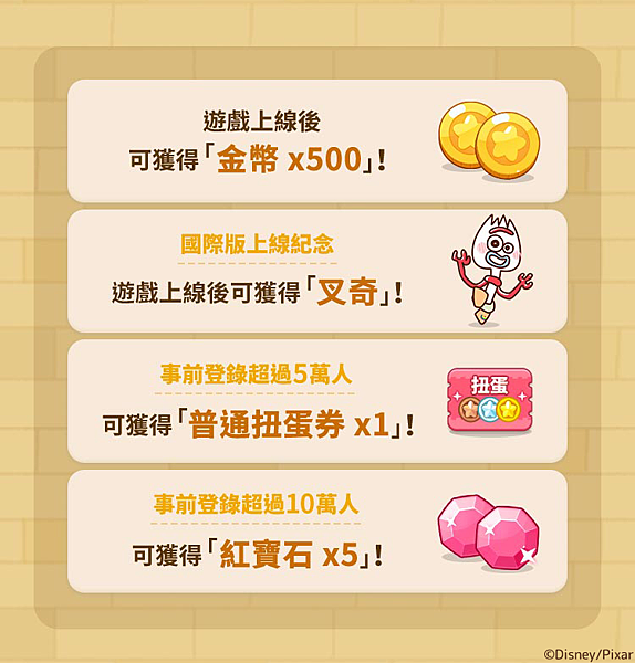 於事前登錄活動期間,在《LINE:Pixar Tower》正式上線後,將可獲得事前登錄獎勵「金幣x500及叉奇」,此外,達成事前登錄註冊累計人數成就,全體玩家皆可獲得額外獎勵,快召集好友一起進行事前登錄吧!