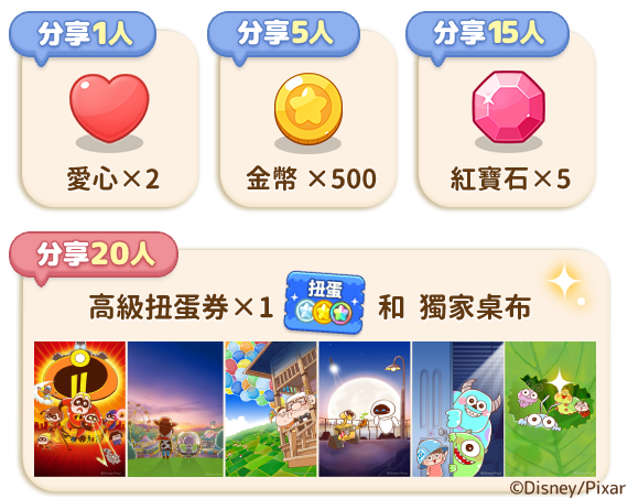 ※ 註:註冊總人數計算方式為 《LINE:Pixar Tower》LINE 官方帳號好友人數。每個遊戲帳號限領取一次。