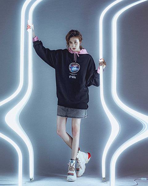 更以日文演繹展現時尚態度!搭配運動風窄管褲與時髦感聯名款腰包,塑造酷玩混搭的潮流風格。