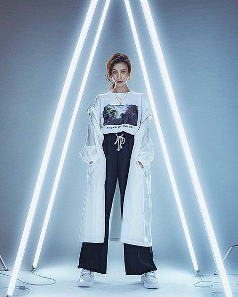 ▲(右)聯名上衣將傳說對決經典「對抗」場景以流行感相片印花設計,外搭白色長版抽繩外套,與下身搭配高腰式抽繩寬褲,讓整體身形比例拉高,穿出絕不妥協的潮系態度。